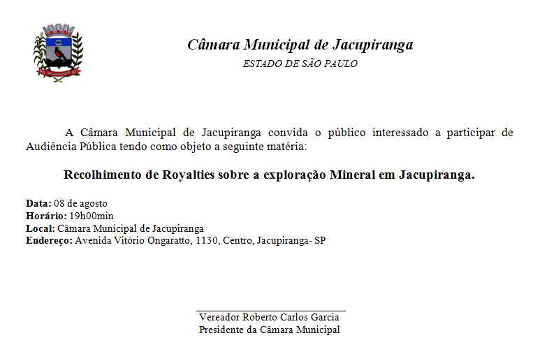 AUDIÊNCIA PÚBLICA – Recolhimento de Royalties sobre a exploração Mineral em Jacupiranga |