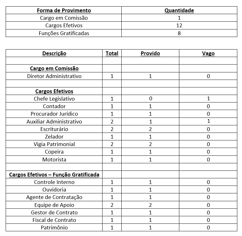 E por fim, para cumprir suas finalidades administrativas, a Câmara Municipal de Jacupiranga tem em sua estrutura organizacional as seguintes cargas (Resolução Nº03 /2016)